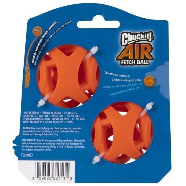 Help your dog spend his boundless reserves of energy with the Chuckit! Air Fetch Ball 2-Pack Dog Toy. These interactive chase-and-fetch toys will provide hours of playtime for you and your furry friend. Featuring a design that allows your dog to breathe easier, run farther and fetch longer. The fetch balls have incredible bounce and durability, bringing new ways to fetch, and have more fun, interactive way to spend time with your best friend. Great for all breeds and all life stages.