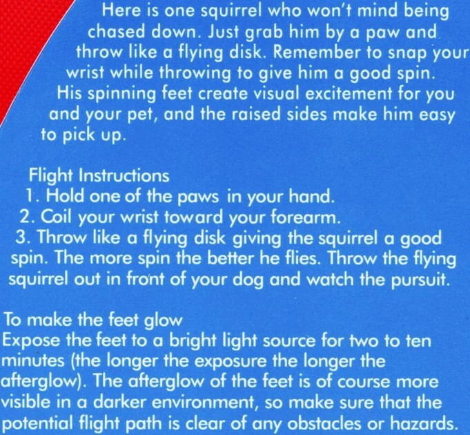 - Throw light a flying disc giving the squirrel a good spin. The more spin the better he flies. Throw the flying squirrel out in front of your dog and watch the pursuit.