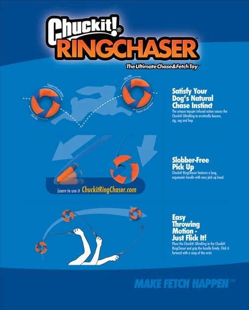 Help your dog spend his boundless reserves of energy with the Chuckit! Ultra Ring Launcher Fetch Dog Toy. This interactive chase and fetch toy will provide hours of playtime for you and your furry friend. Featuring a long, ergonomic handle with easy pick-up head, the toy allows you to keep playing fetch with your pal for longer. The unique topspin-infused action causes the toy to erratically bounce, zig-zag and hop on the ground like real game, engaging your dog’s natural chase instincts. The ring launcher brings a new way to fetch, creating more fun, interactive way to spend time with your best friend.