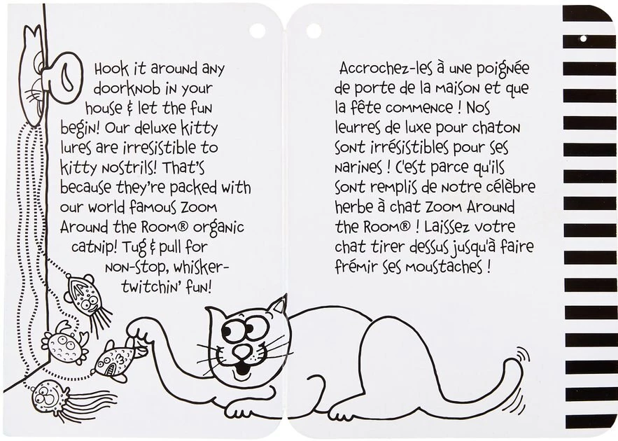 Hook it around any doorknob in your house, and let the fun begin! The dee-lux Kitty Lures are irresistible to kitty nostrils! That’s because they’re packed with the world-famous Zoom Around the Room high-test organic catnip! What’s more, the action packed lures are interchangeable and replaceable! Tug and Pull for non-stop, whisker-twitchin’ fun!
