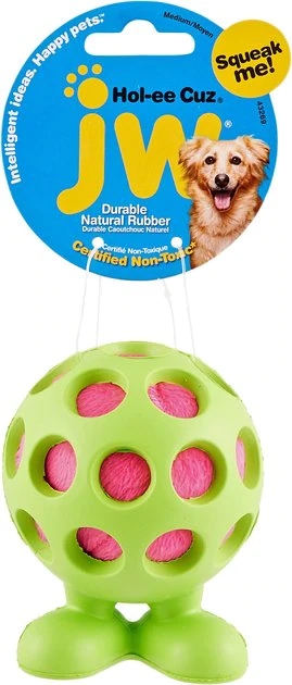 JW Hol-ee Cuz is just the toy to keep your dog entertained for hours. It features a durable, natural rubber outside with holes for easy gripping and a soft plush middle that hides a squeaker for added fun. The Cuz toy is long-lasting and great for tossing, fetching and chewing.