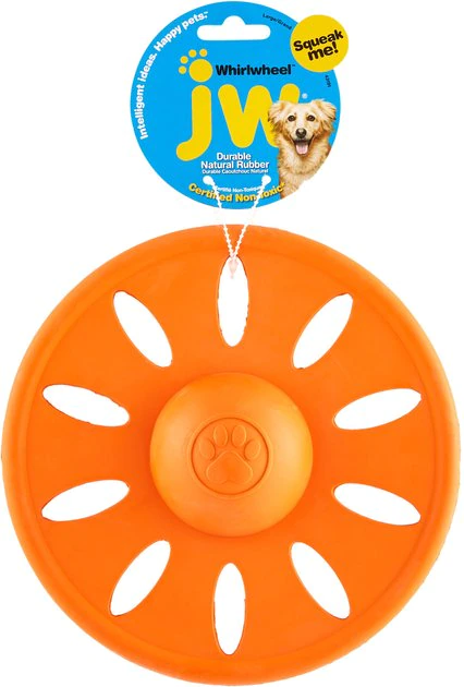 The Large Whirlwheel is a flying disk with a squeaker in the center. This natural rubber wheel is flexible and has a distinctive squeak to each size toy. It is a tug, chew, teething and flying toy with a novel twist, it also squeaks! This toy does it all. Great for medium and large breeds.