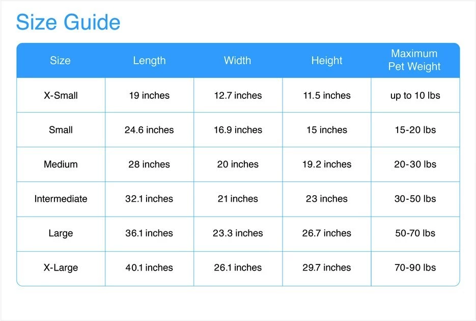 | Size | Length | Width | Height | Maximum Pet Weight | |