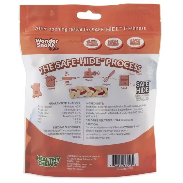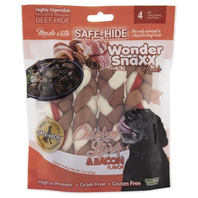 - Ingredients include beef hide and the flavors of chicken liver and bacon.