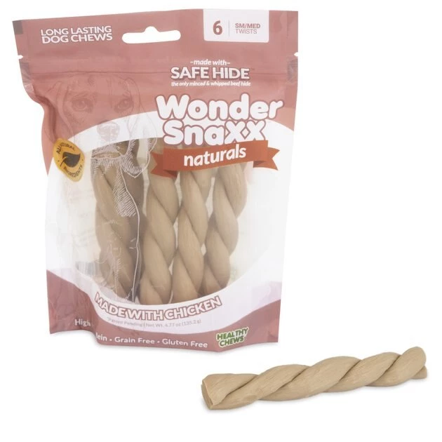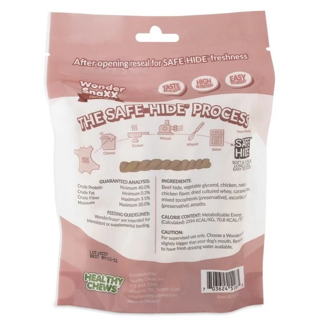 Enjoy a new twist on a classic treat with Petmate Wonder SnaXX Twists Chicken Grain-Free Dog Treats. These special dog treats are made with a minced, whipped beef hide that’s designed to be softer and easier to digest than traditional rawhide. Each twist is packed with chicken flavor, and plenty of protein to help support your dog’s muscles and immune system. Sit back, relax and watch on while your pup devours this irresistible snack!