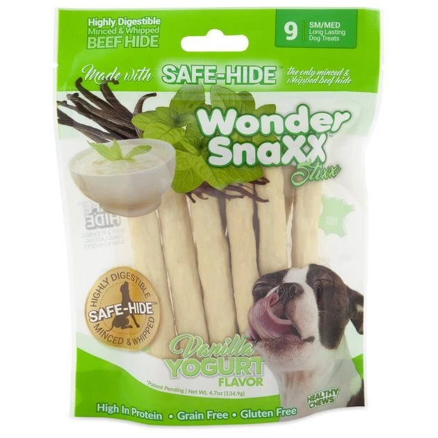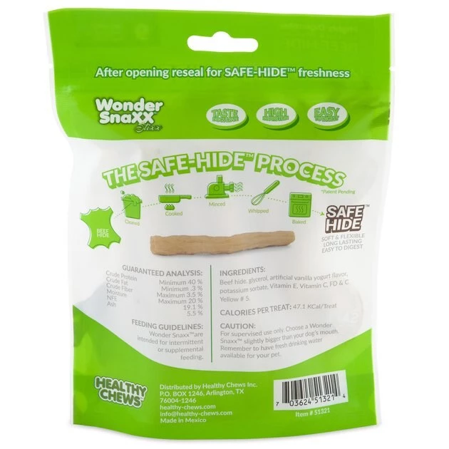 Use the paw-some flavor of creamy vanilla yogurt to help maintain healthy teeth and gums in your hound with Petmate Wonder StiXX Vanilla Yogurt Flavor Dog Treats. Crafted to help satisfy his natural chewing instinct, your doggo will be advancing his dental health with every bite. Processed to help create a safer beef-hide chew, the whipped and minced formula gives your doggo the texture he craves with the flavor he loves. These treats are designed to be long-lasting, mess-free and with the goal of being four times more digestible than traditional rawhide. You’ll appreciate having the peace of mind of knowing that your doggo is snacking safely every time you reach for the bag.